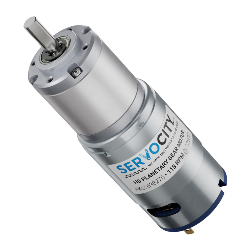 This 118 RPM brushed HD Premium Planetary Gear Motor packages a planetary gearbox and a 6mm D-shaft to drive your project.